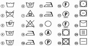 Pateikiame dažniausiais aptinkamus drabužių priežiūros simbolius ir jų reikšmes: